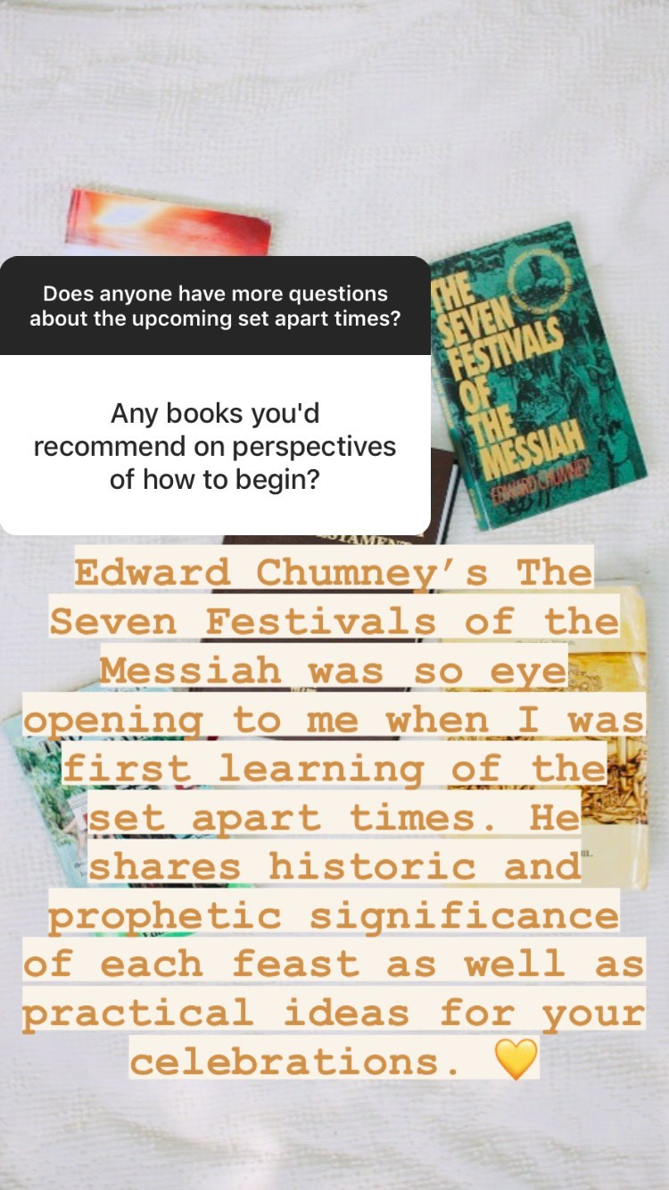 Edward Chumney's The Seven Festivals of the Messiah was so eye-opening to me when I was learning about these set apart times. He shares historic and prophetic significance of each feast as well as practical ideas for your celebrations.